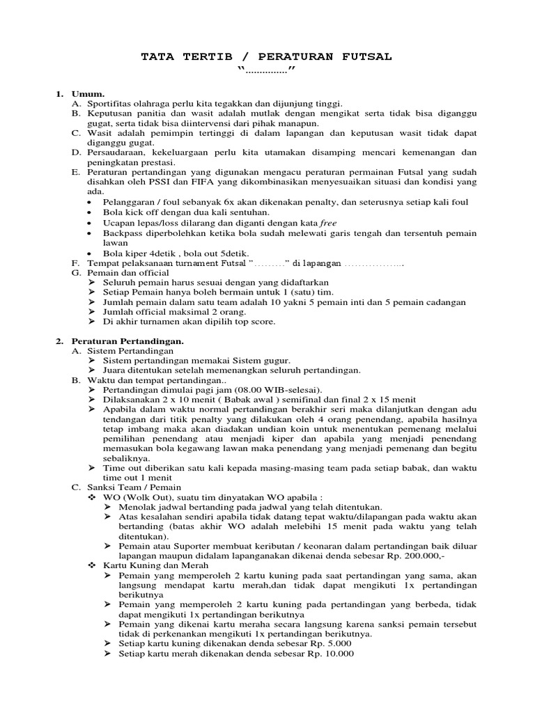 Peraturan turnamen futsal tersebut juga berlaku pada pertandingan liga futsal dimana setiap ketentuannya menggunakan peraturan resmi dari pssi maupun fifa. 857 downloads 8655 Views 526KB Size. Peraturan turnamen futsal tersebut juga berlaku pada pertandingan liga futsal dimana setiap ketentuannya menggunakan peraturan resmi dari PSSI maupun FIFA.